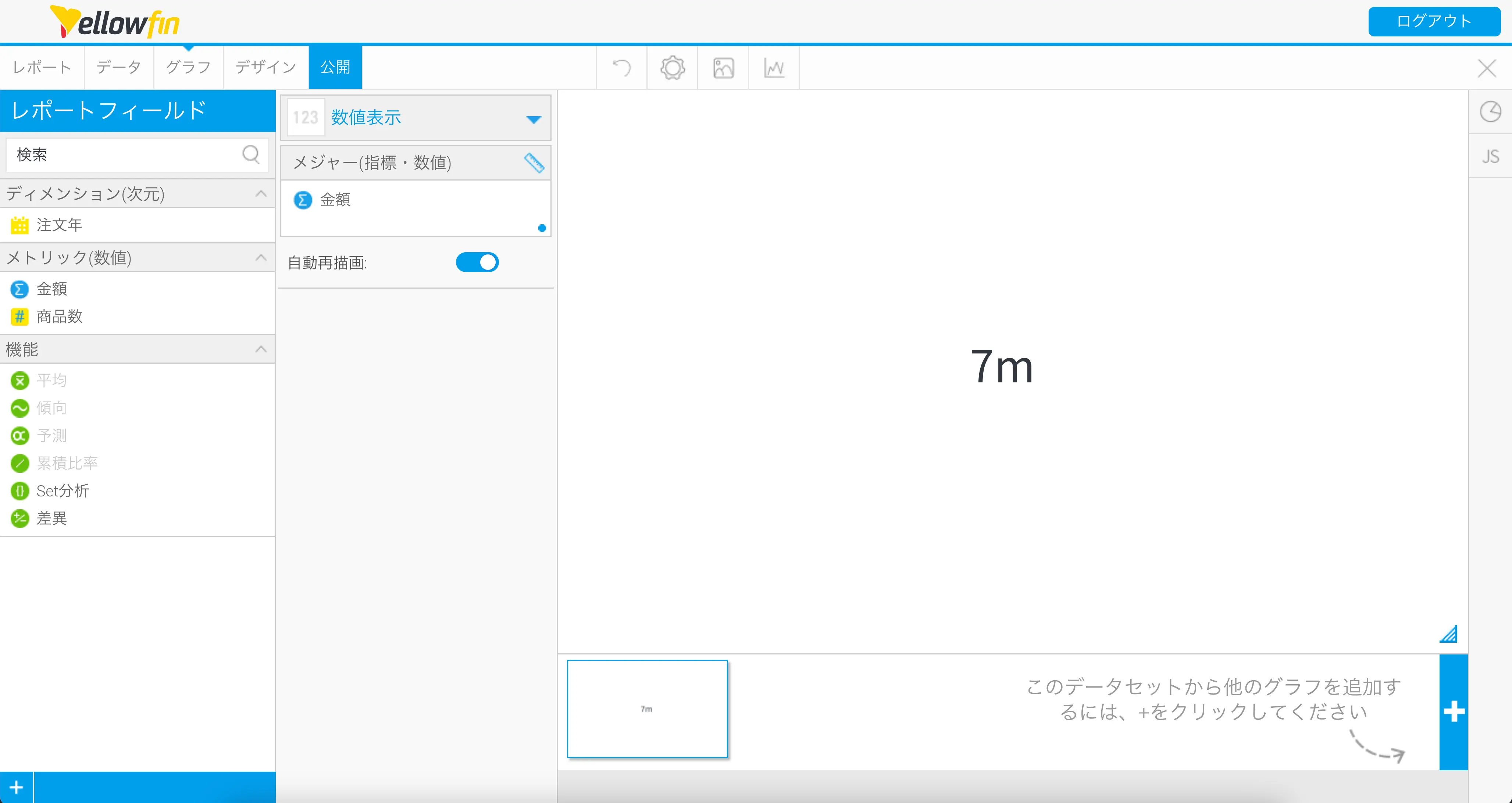 全体を集計して作成するグラフに関しては、今回は数値全体の合計値を表示するだけなので、他の集計軸を持つグラフと同じレポートで作成することができます。ただし、全体の平均値を表示する場合や複雑な集計が必要なレポートの場合は、この限りではありませんので注意してください。