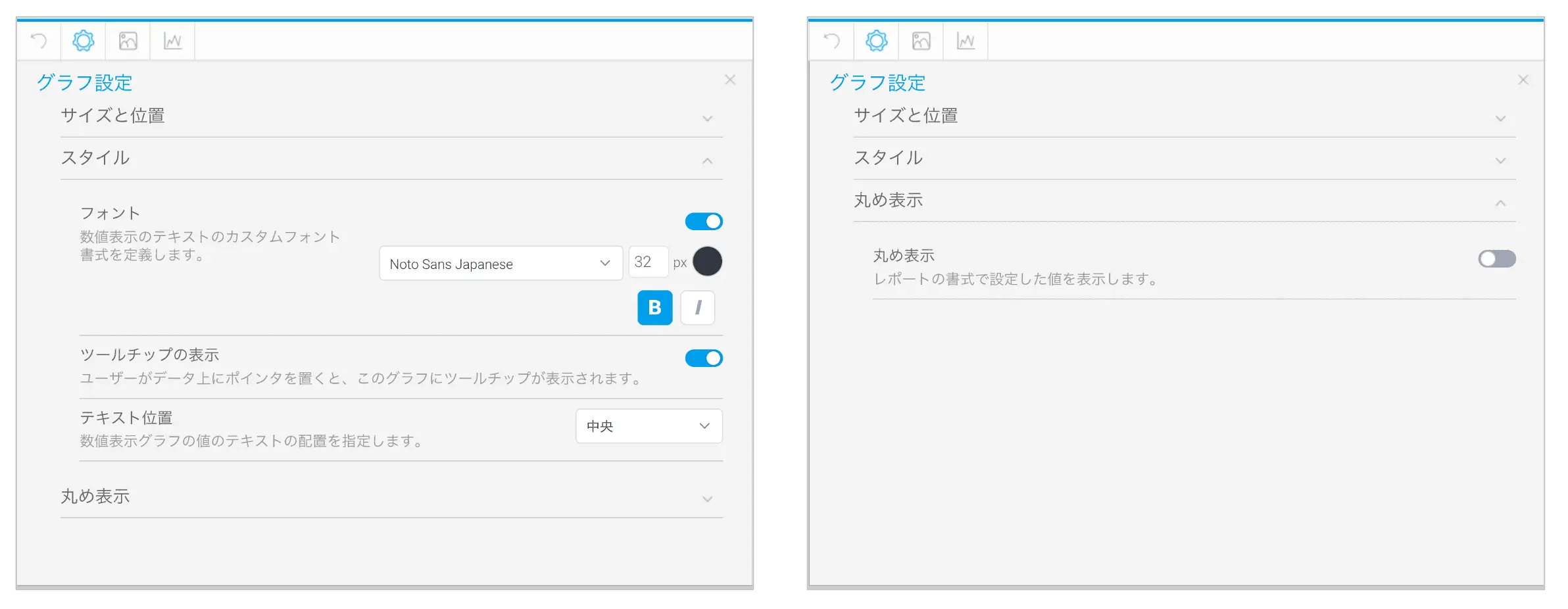 グラフの見栄えを整えていくために、書式を設定します。グラフ設定丸め表示から、丸め表示を無効にします。同じく、グラフ設定スタイルからフォントのスタイルとサイズを変更しまここで、第2回で完成イメージを作成したときにまとめた内容が役に立ちます