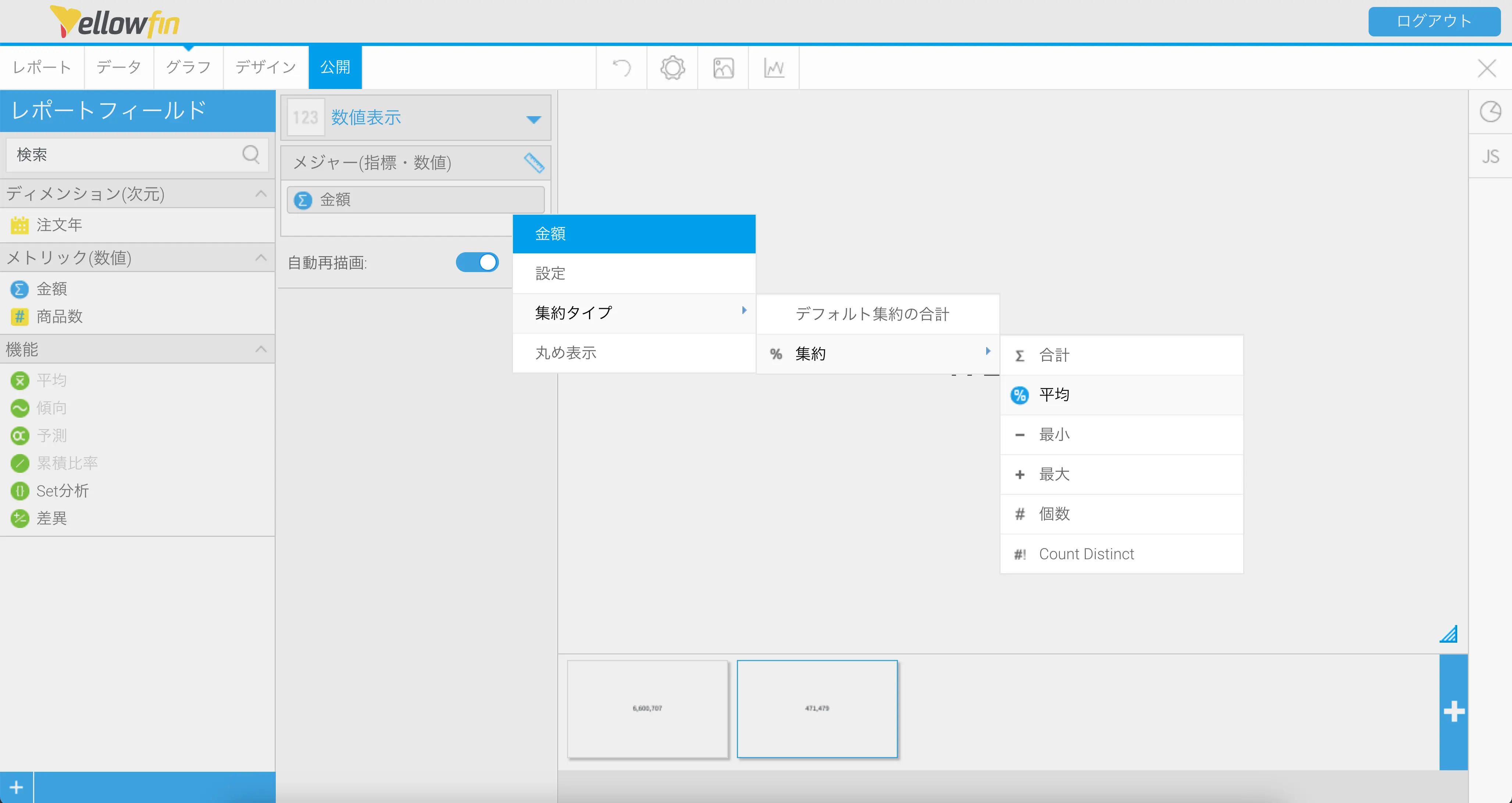コピーしてできた2つめのグラフの金額集約タイプ平均に設定してください。これで注文金額の年間平均を表示する数値表示グラフのできあがりです。ちなみに、ここで設定した集約タイプは、表の数値を使用して合計値・平均値などを算出する仕組みになっています。表には、それぞれの年の合計注文金額が表示されているので、グラフには年間合計注文金額の平均値が表示されることになります。