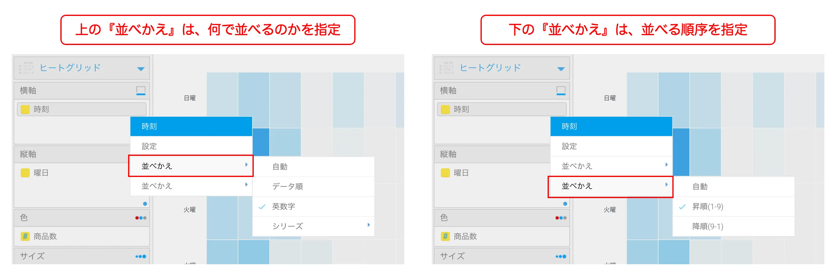 表ができあがったら、ヒートグリッドグラフを作成していきます。グラフの種類を『ヒートグリッド』に切り替えたら、『横軸』に【時刻】、『縦軸』に【曜日】、『色』に【商品数】を設定します。グラフの横軸 (時刻) と縦軸 (曜日) の並び順がバラバラなので、それぞれを『英数字』の『昇順 (1-9)』で並べかえます。