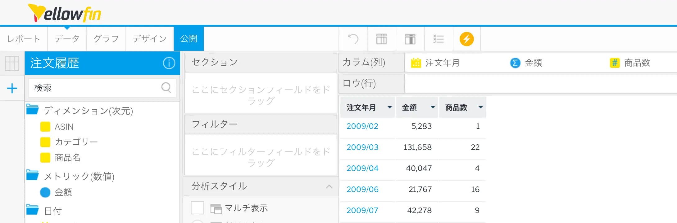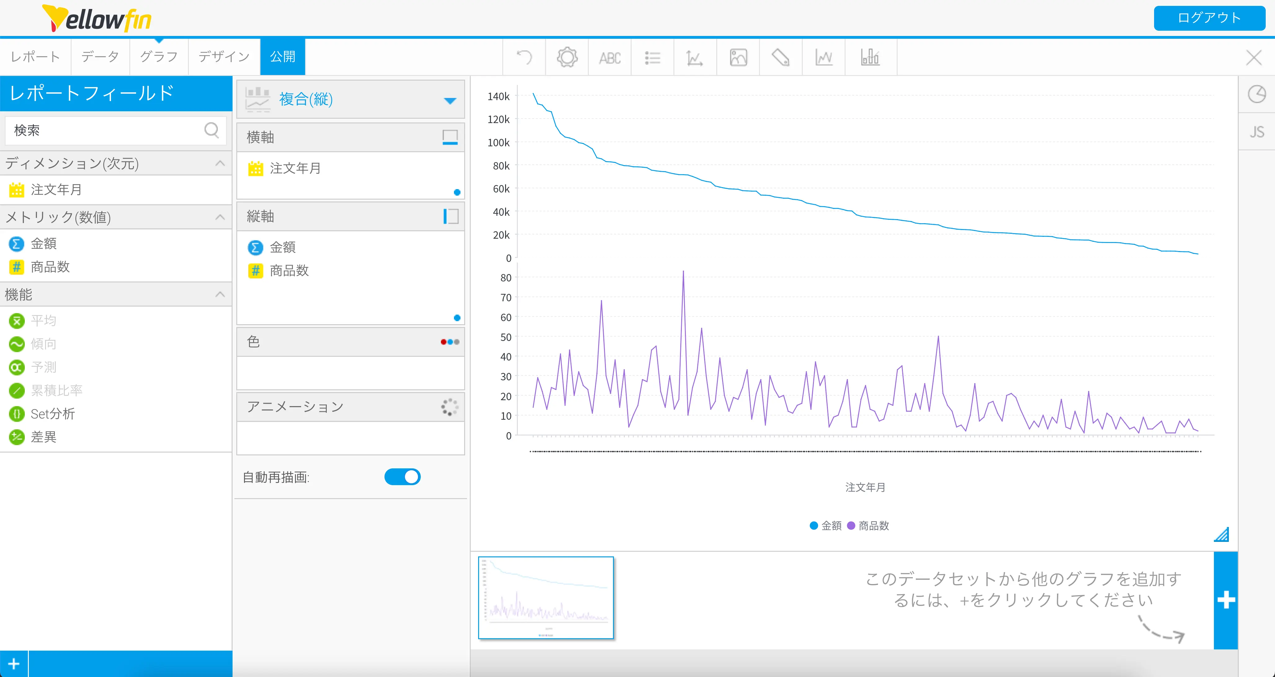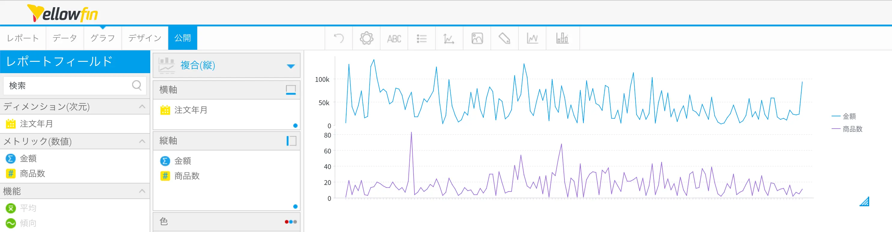 今回は、年月を軸に集計するレポートを作成して、線グラフを作成します。線グラフと言っても、注文金額と注文商品数の2つを表示したいので、今回作成するグラフの種類としては、複合カテゴリーグラフになります。