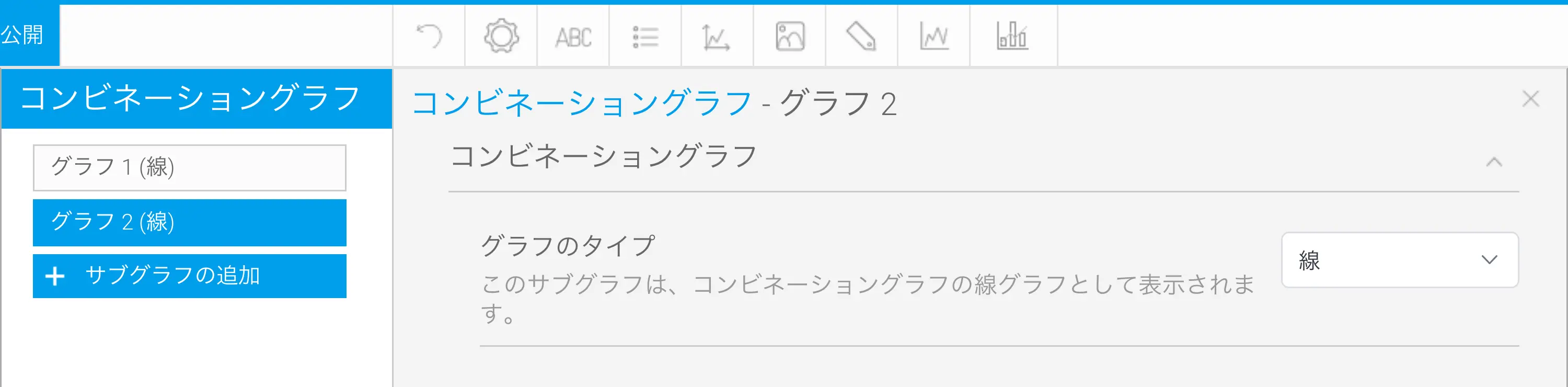 縦軸の金額と商品数の単位が掛け離れているため、それぞれ別のグラフとして表現します。『コンビネーショングラフ』の設定で『サブグラフの追加』をクリックすることで、縦軸を増やしたら、それぞれの『グラフのタイプ』を『線』に設定します。