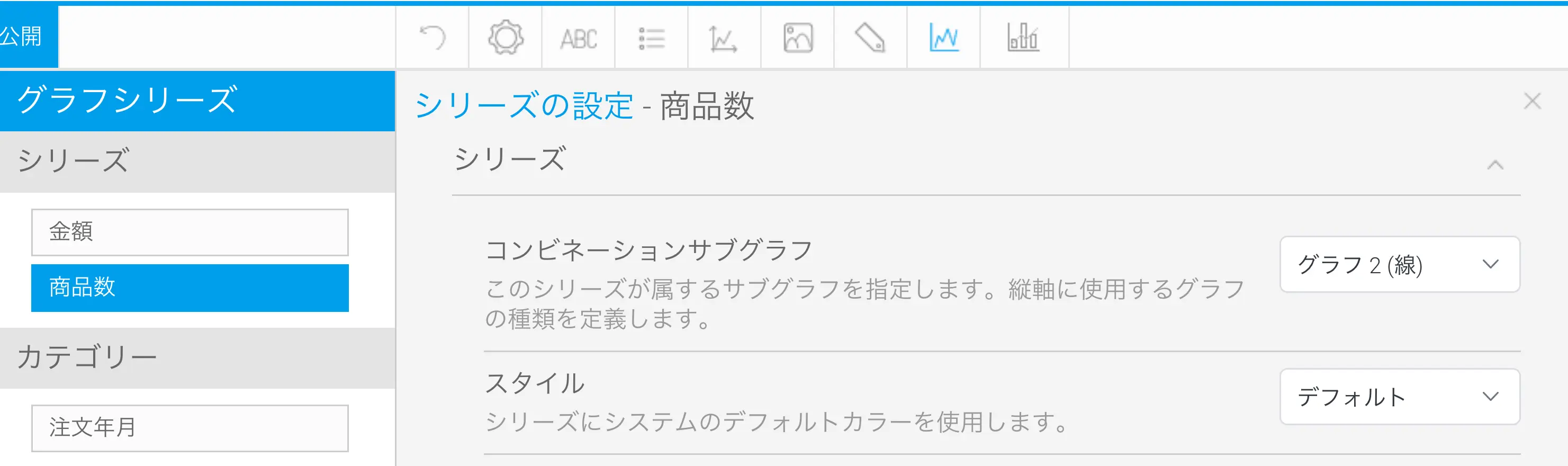 追加したサブグラフは、『シリーズの設定』の『コンビネーションサブグラフ』で割り当てることができます。『金額』の『コンビネーションサブグラフ』を『グラフ1 (線)』に、『商品数』の『コンビネーションサブグラフ』を『グラフ2 (線)』に設定します。