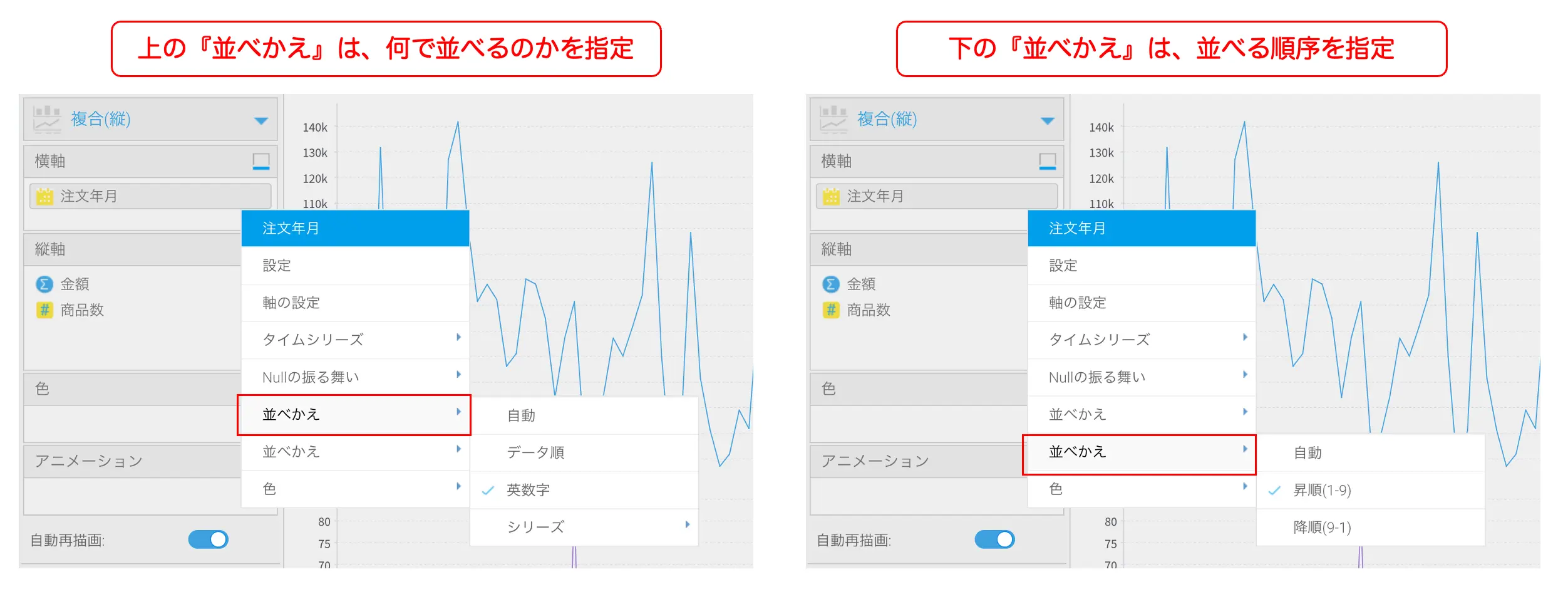 グラフが完成したかのように見えますが、グラフの横軸 (注文年月) が日付順に並んでいないので、『英数字』の『昇順 (1-9)』で並べかえます。