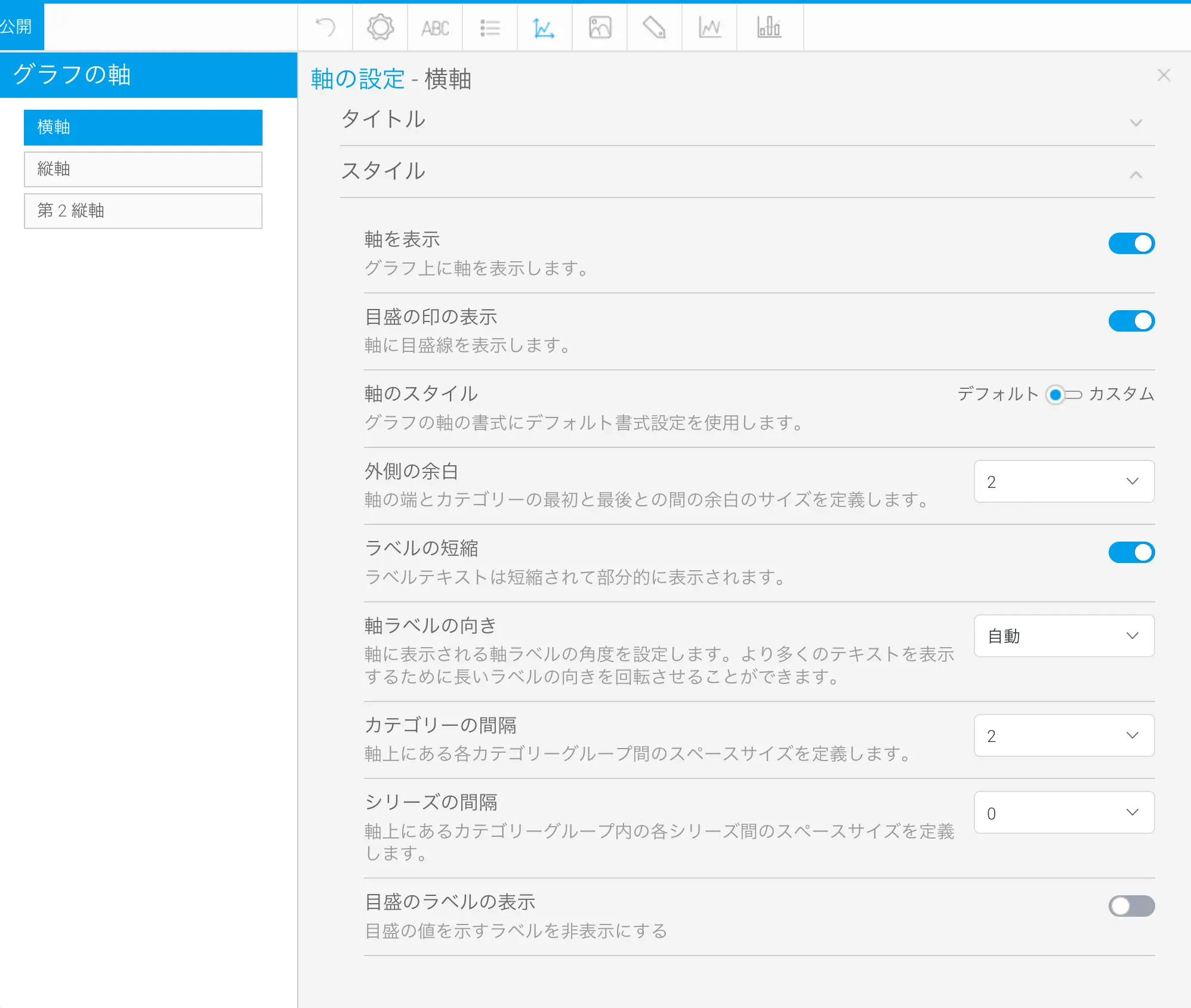 縦横軸のタイトルは必要ないので非表示にしてしまいます。縦横軸のタイトルは『軸の設定』から『縦軸』または『横軸』を選択して、『タイトル』>『軸タイトルの表示/非表示』を『非表示』に設定します。