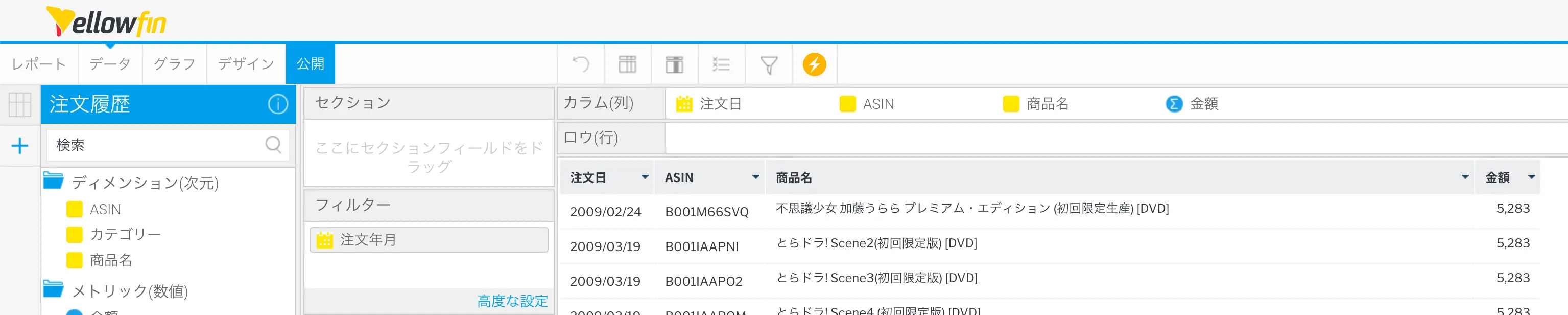 以上で、注文明細のレポートを作成することができました。公開ボタンをクリックしてレポートを保存してください。