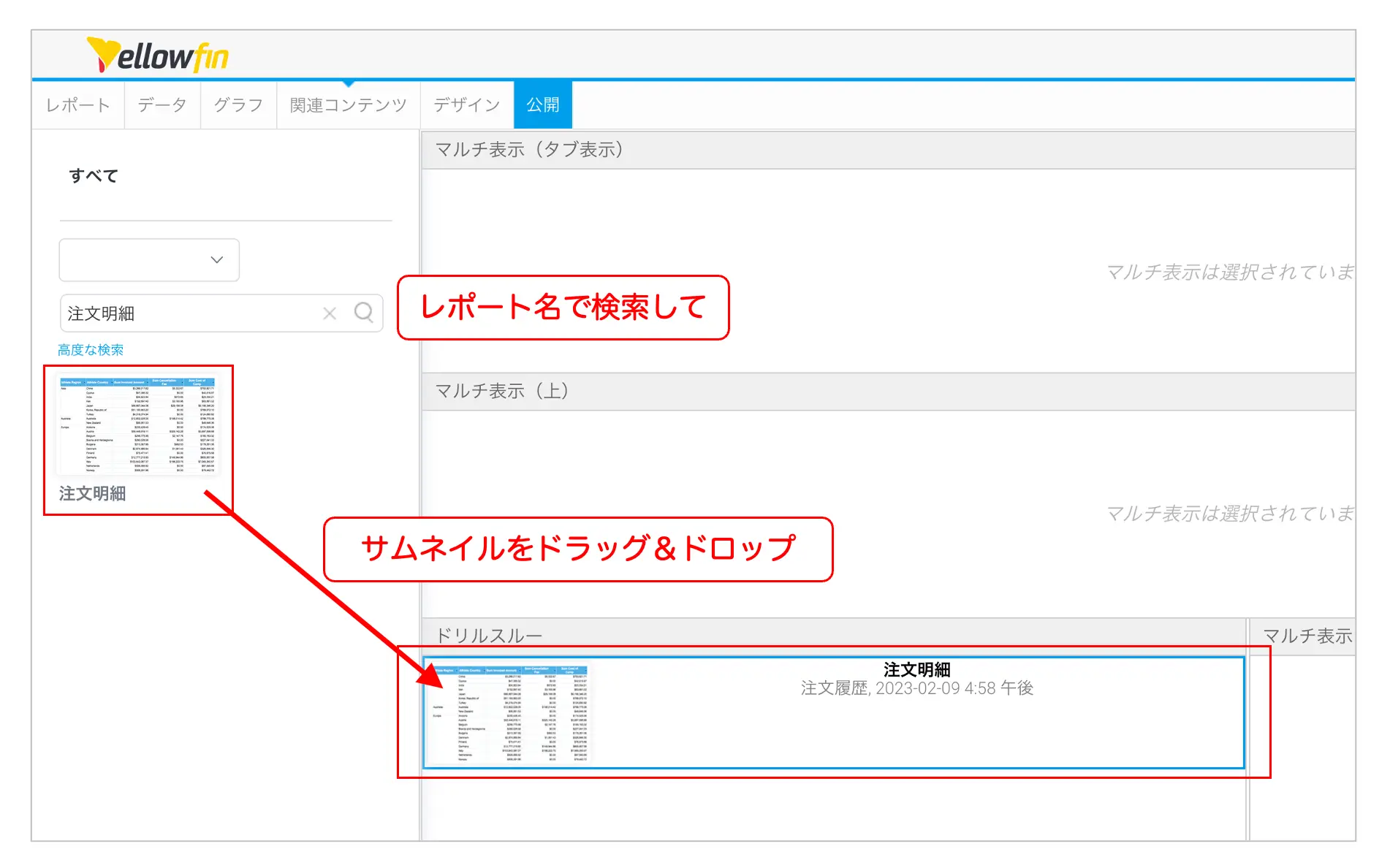 『関連レポート』画面では、画面左側にレポートのサムネイルが一覧されています。検索窓にレポートの名前を入力するとドリルスルー先 (子) のレポートを簡単に見つけることができると思います。画面中央に『ドリルスルー』と書かれた枠があるので、この中に注文明細レポートのサムネイルをドラッグ&ドロップして、ドリルダウンの設定を行います。