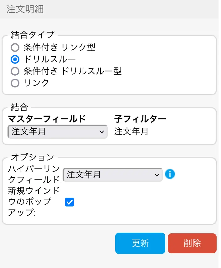 画面右側の設定パネルで『マスターフィールド』と『ハイパーリンクフィールド』にそれぞれ【注文年月】を設定し、『新規ウィンドウのポップアップ』のチェックを入れたら『更新』ボタンをクリックして、ドリルスルーの設定は完了です。公開ボタンをクリックしてレポートを保存してください。