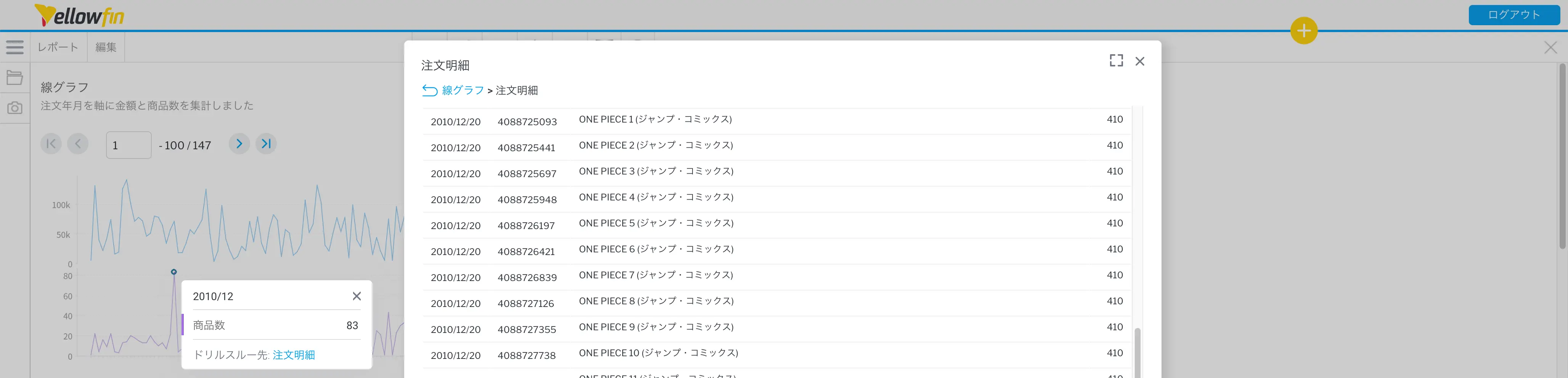 今回は、注文明細のレポートを作成して、ドリルスルーを作成したいと思います。前回作成した線グラフをクリックしたら、その月に注文した商品の明細が表示されるような仕組みを作っていきます。
