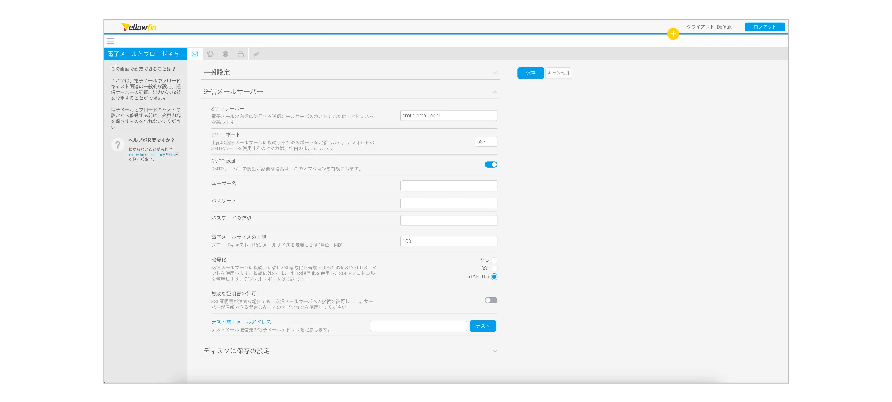 Yellowfinにログインし、管理>システム構成>電子メールとブロードキャストのページで、送信メールサーバーの設定を行います。先ほど取得したアプリパスワードをパスワードに設定してください。主なパラメーターは下記の通りです。