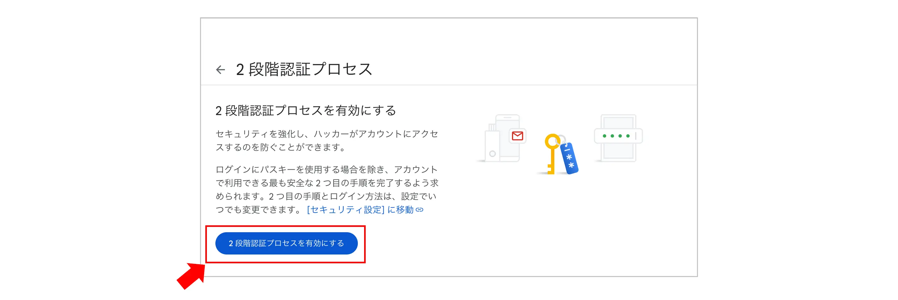 セキュリティのページにアクセスし、2段階認証プロセスが有効になっていることを確認してください。2段階認証プロセスが無効になっている場合は、次の手順で有効にします。