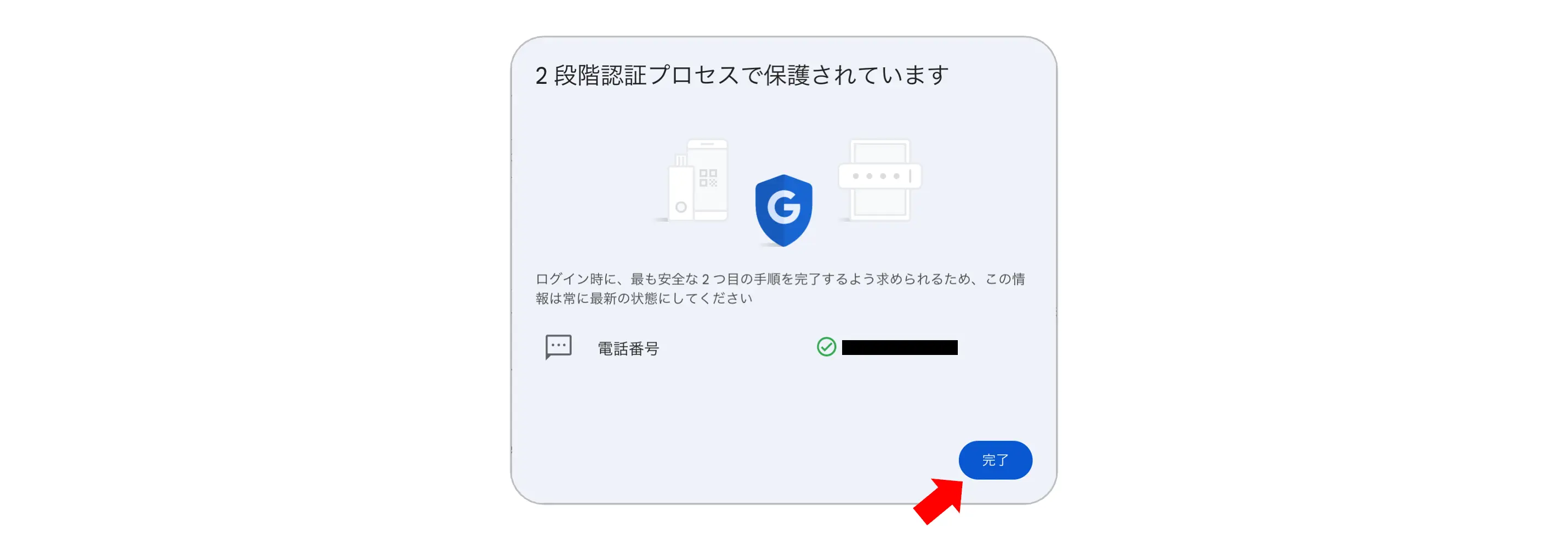 2段階認証プロセスで保護されていますと表示されたら完了ボタンをクリックします。これで2段階認証が有効になりました。