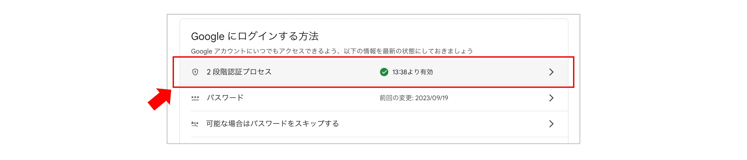 Googleにログインする方法にある、2段階認証プロセスをクリックします。