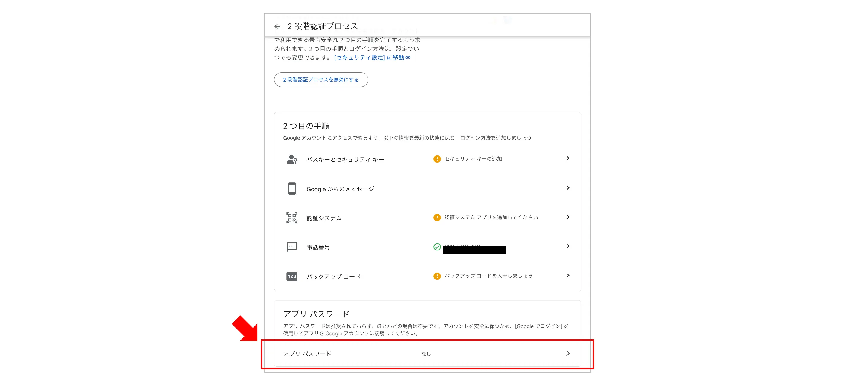 2段階認証が有効になったら、アプリパスワードを発行します。2段階認証プロセスをクリックします。