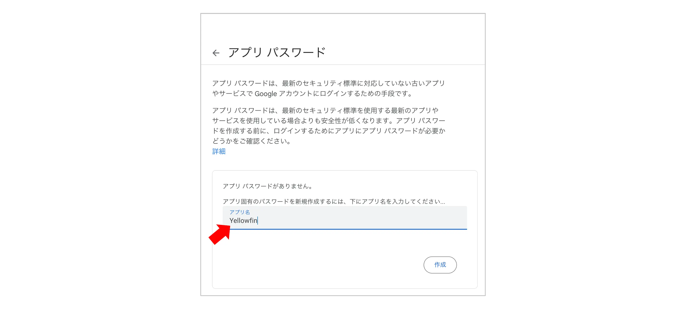 アプリパスワードの画面で、アプリ名を入力します。ここではYellowfinと入力しました。