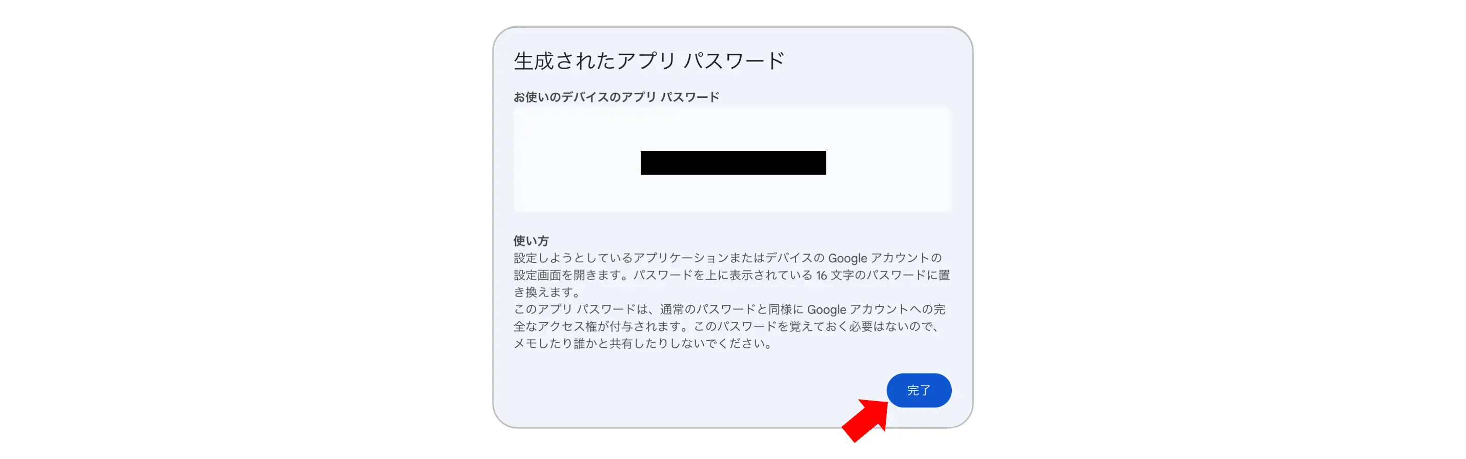 アプリパスワードが生成されますので、これを控えます。完了ボタンをクリックすると生成されたアプリパスワードを再確認することはできないようなので、注意してください。アプリパスワードを忘れてしまった場合は、改めてアプリパスワードを生成する必要があるようです。