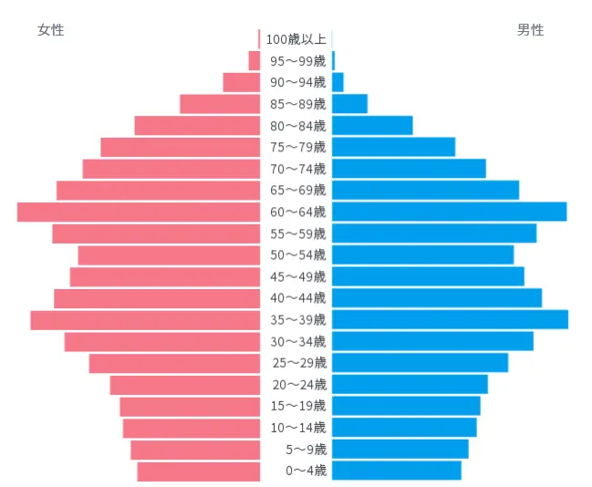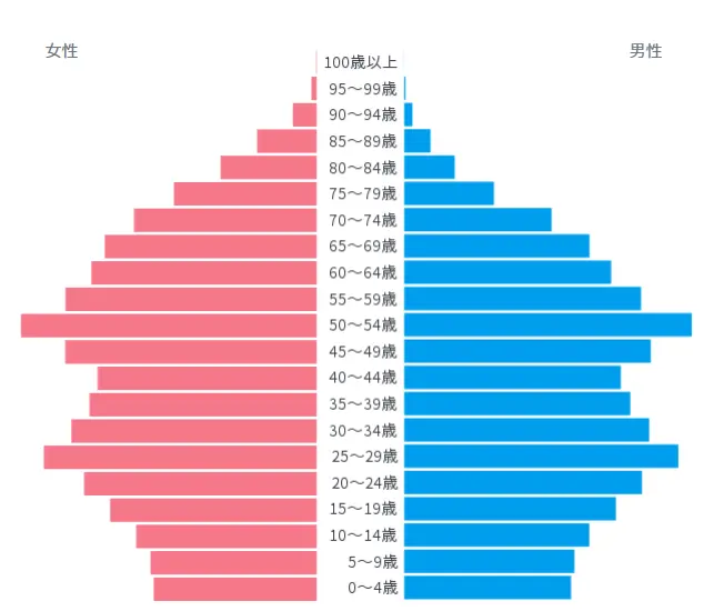 つぼ型と呼ばれる形状で、50歳代前半と20歳代後半の年齢層の前後が突起した形状です。生産年齢人口の割合が多く、高齢者層を社会で支えられています。しかし、10歳代以下の年齢層で人口が減少し始めており、少子高齢化社会を迎えつつあることが分かります。