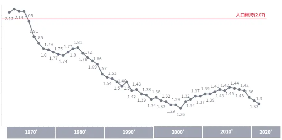 一般的に、人口を維持するためには、2.07以上の合計特殊出生率が必要と言われています。しかし、日本の合計特殊出生率は1970年代半ば以降、人口維持に必要な数値を下回り続けているのが分かります。2020年代に入ると、コロナ禍の影響もあり、数値が更に減少傾向に向かっています。