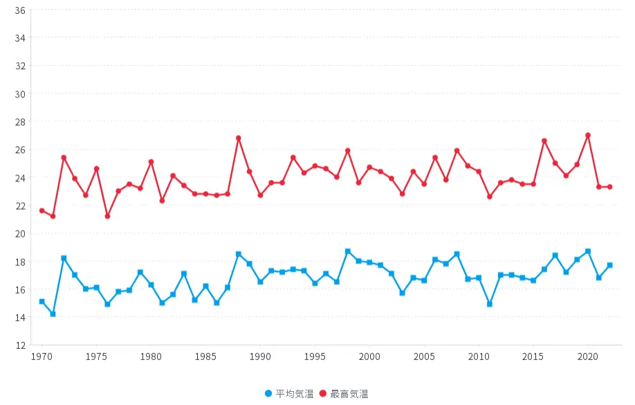 下の線グラフは、那覇市の8月の平均気温と最高気温の推移です。平均・最高気温ともに、年を追って徐々に上がりつつあるように見受けられます。また、1990年代後半以降、最高気温が34度を超える年が増えているのが分かります。