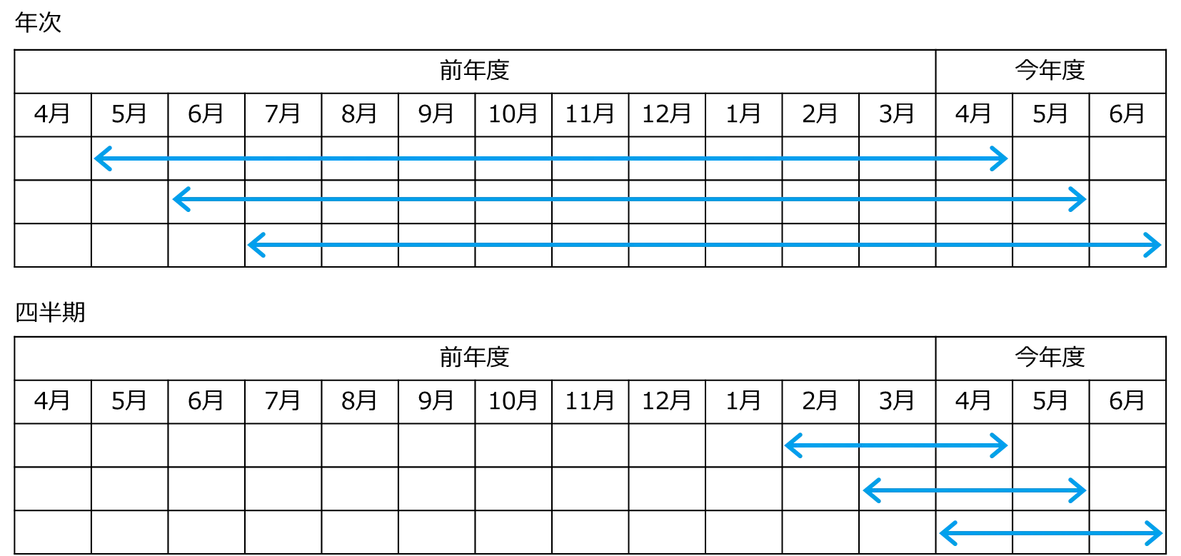 “移動合計” の考え方を簡単に紹介します。先述の通り、移動合計とは、当該時点からある一定期間の合計のことを指します。年次の場合、該当月を含む過去12か月分の合計のことを指します。この場合、移動年計とも呼ばれます。四半期の場合、該当月を含む過去3か月分の合計を意味します。移動合計を用いることで、単年度の数値だけではつかむことができない大きな傾向を把握することができます。
