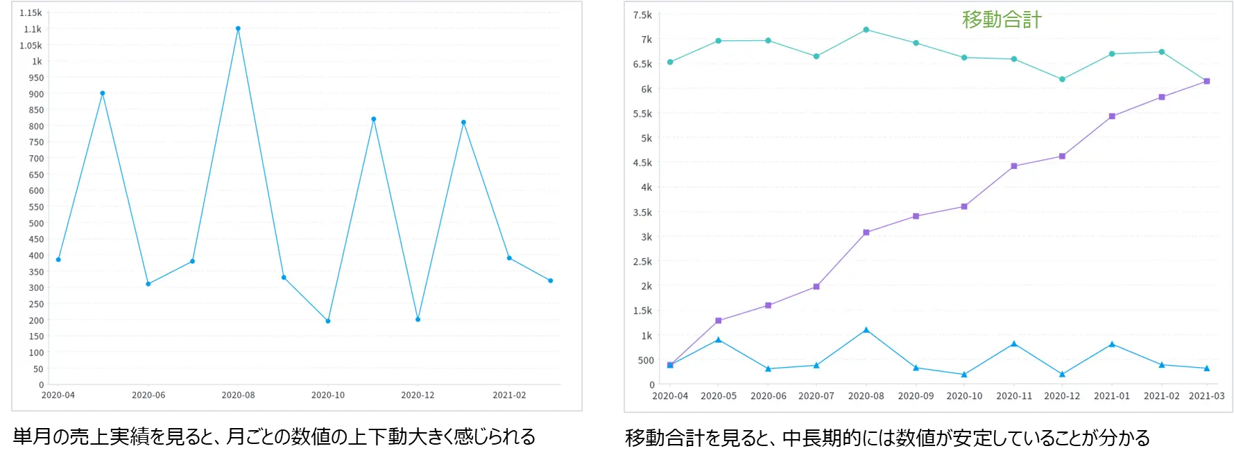 移動合計を実際のZチャートで確認してみます。左は売上実績を単月で見ている折れ線グラフです。月ごとの上下動が激しく、大きな傾向をつかむことができません。