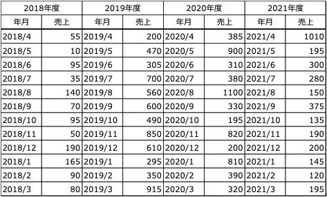例えば、下記の表は、2018年度から2021年度の4年度分の月次の売上実績を示すものです。月ごとの数値の上下動が激しく、表を観ただけでは傾向をつかむことが難しいと感じます。
