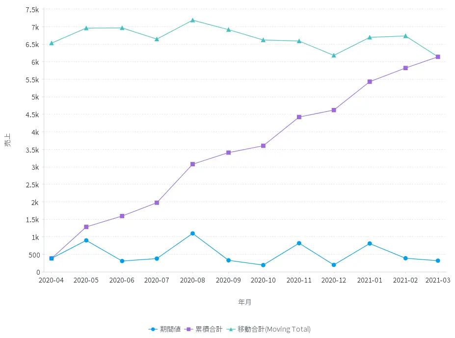2020年度は「横ばい」と呼ばれる形態で、事業が安定期に入ったことが分かります。月次の売り上げが大きく上下に振れているものの、移動合計の線を見てみると、横ばい傾向であることが把握できます。