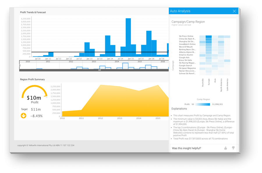 幸いなことに、Yellowfinは機械学習と人間の気付きを組み合わせることで、これを自動化し、ビジネス全体を最速で「なぜ」に導くことができます。これにより、ビジネスユーザーは必要な答えを素早く引きだせるようになるため、アナリストは、ビジネス課題へのさらに詳細なインサイト提供に、より多くの時間を割くことができるようになります。