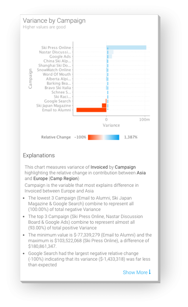 ダッシュボード上でボタンをクリックするだけで、グラフデータの説明や、2つのデータ間の比較を行います。結果は、自動生成グラフとして提供され、ダッシュボード上にはナラティブも表示されます。提供されるビジュアライゼーションは、ユーザーに最も関連の高い順に表示されます。