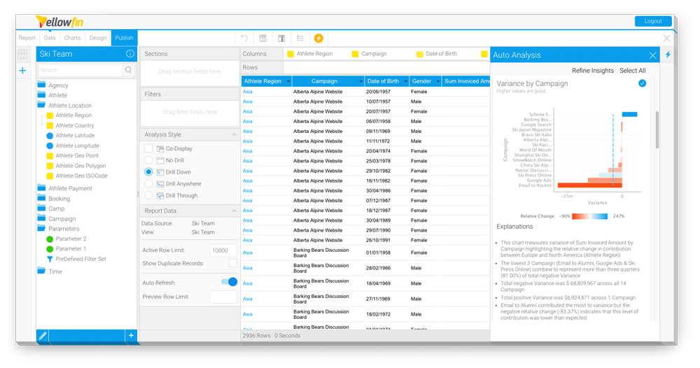 データアナリストはその時間の大部分を、手作業でのレポート作成や、ビジネスからの依頼対応に費やしています。手作業でのデータディスカバリーでは、数多くの手順に従わなくてはいけません。しかし、Yellowfinはこれを即座に実行します。分析に必要なデータをレポートビルダーにドラッグしたら、搭載されたインサイトボタンをクリックするだけで完了です。