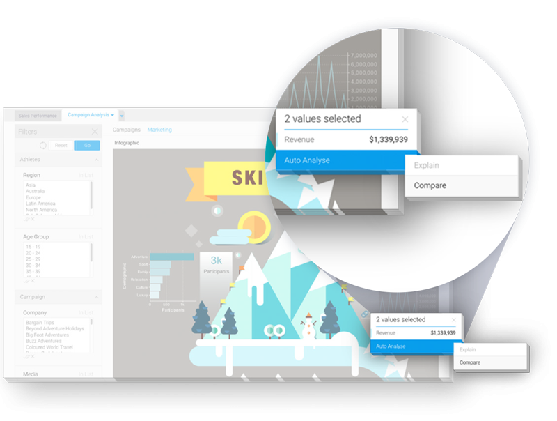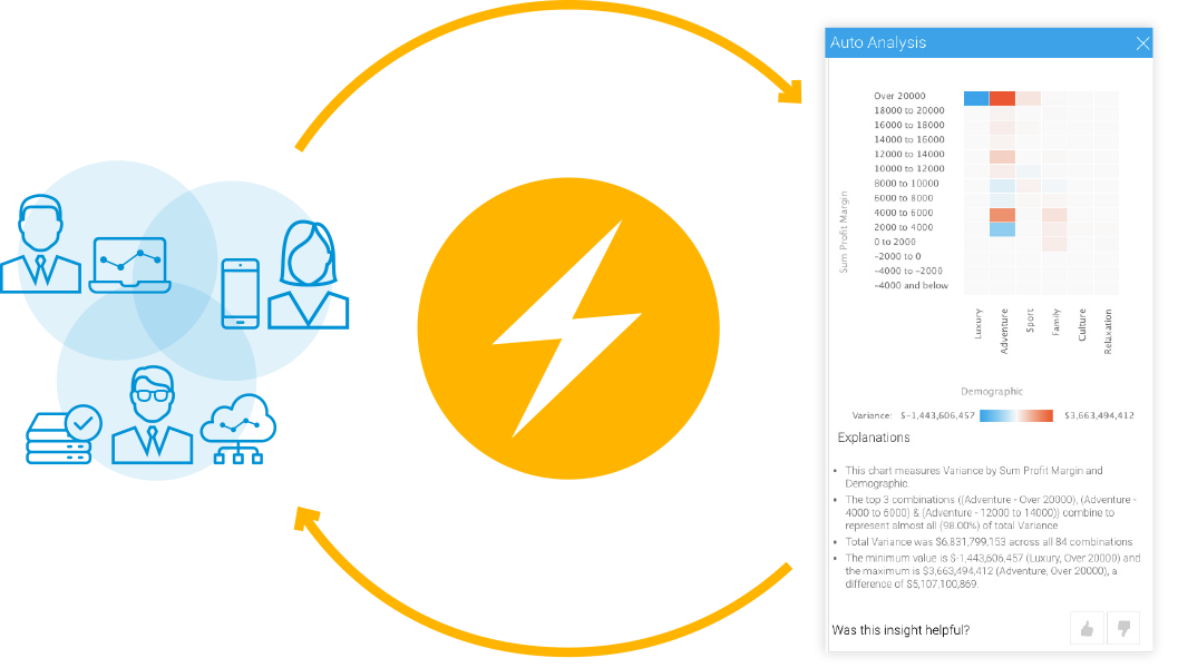自動インサイトは、どこにあるか分からないインサイトを引き出すために、すべてのデータを掘り下げなくても、適切な答えを素早く、自動的に提供することができます。ユーザーが質問を投げかけるだけで、Yellowfinは分析に必要なデータを取得し、様々なステップを実行して、統計的に最も関連のある結果を導き、理解しやすいビジュアライゼーションとナラティブとして表示します。