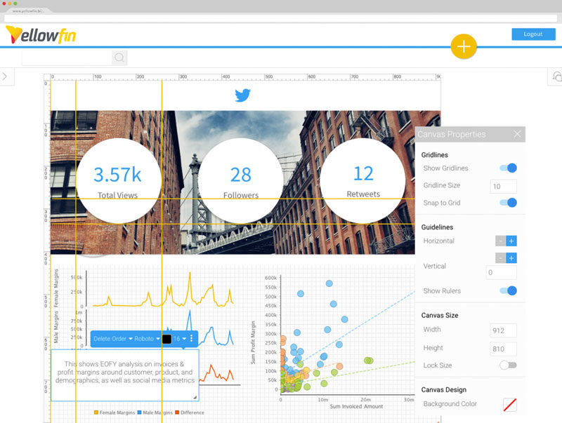 Yellowfin’s content design canvas provides the power and freedom to quickly create beautiful, purpose-built analytical content. Meet your organization’s customized content needs, exceed expectations and drive user adoption – all without writing one line of code. Be empowered to modify and position every element and aspect of the canvas perfectly, down to the individual pixel. Stunning infographic reporting is now just a few clicks away.
