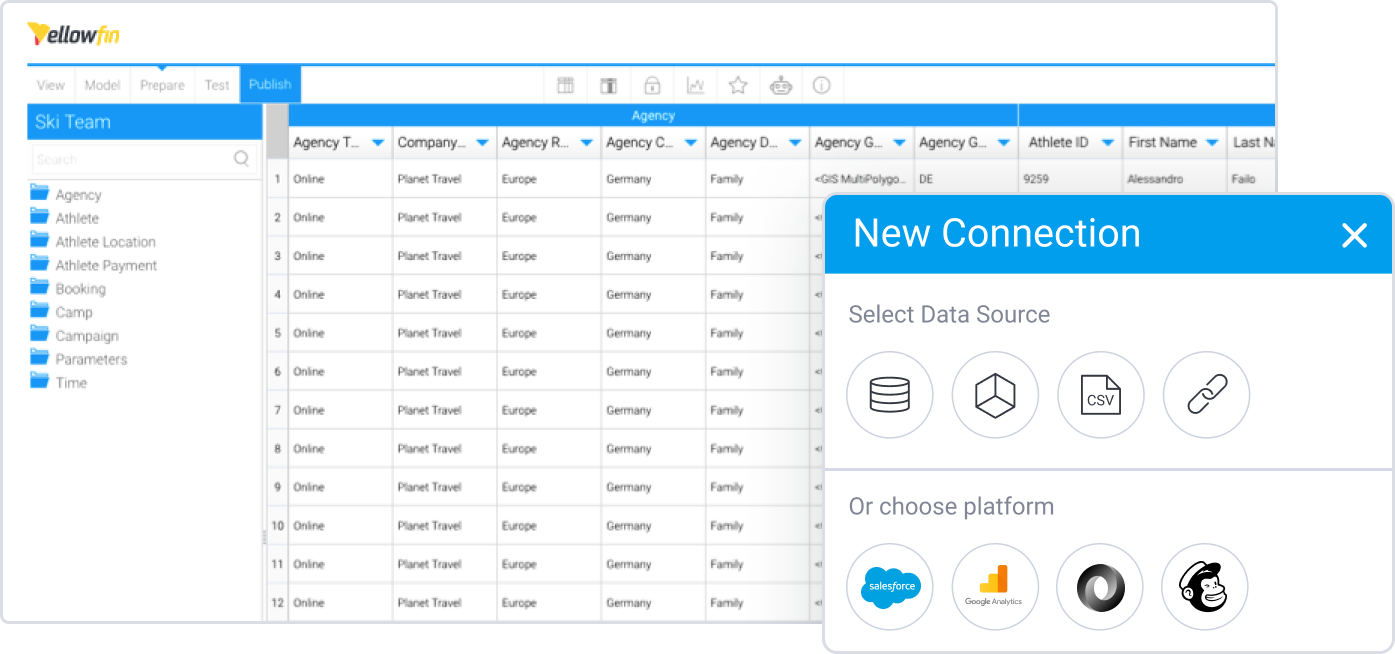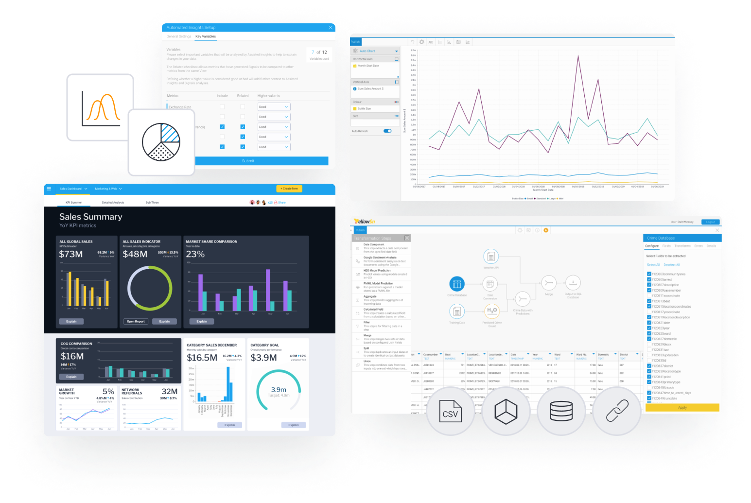 あらゆる分析プロジェクトを成功させるためには、データを分析できる状態にしておく必要があります。Yellowfin データ準備では、あらゆるデータソースに接続し、データを抽出するために必要なすべての機能をそなえているので、手動分析と自動分析の両方のデータを準備することができます。