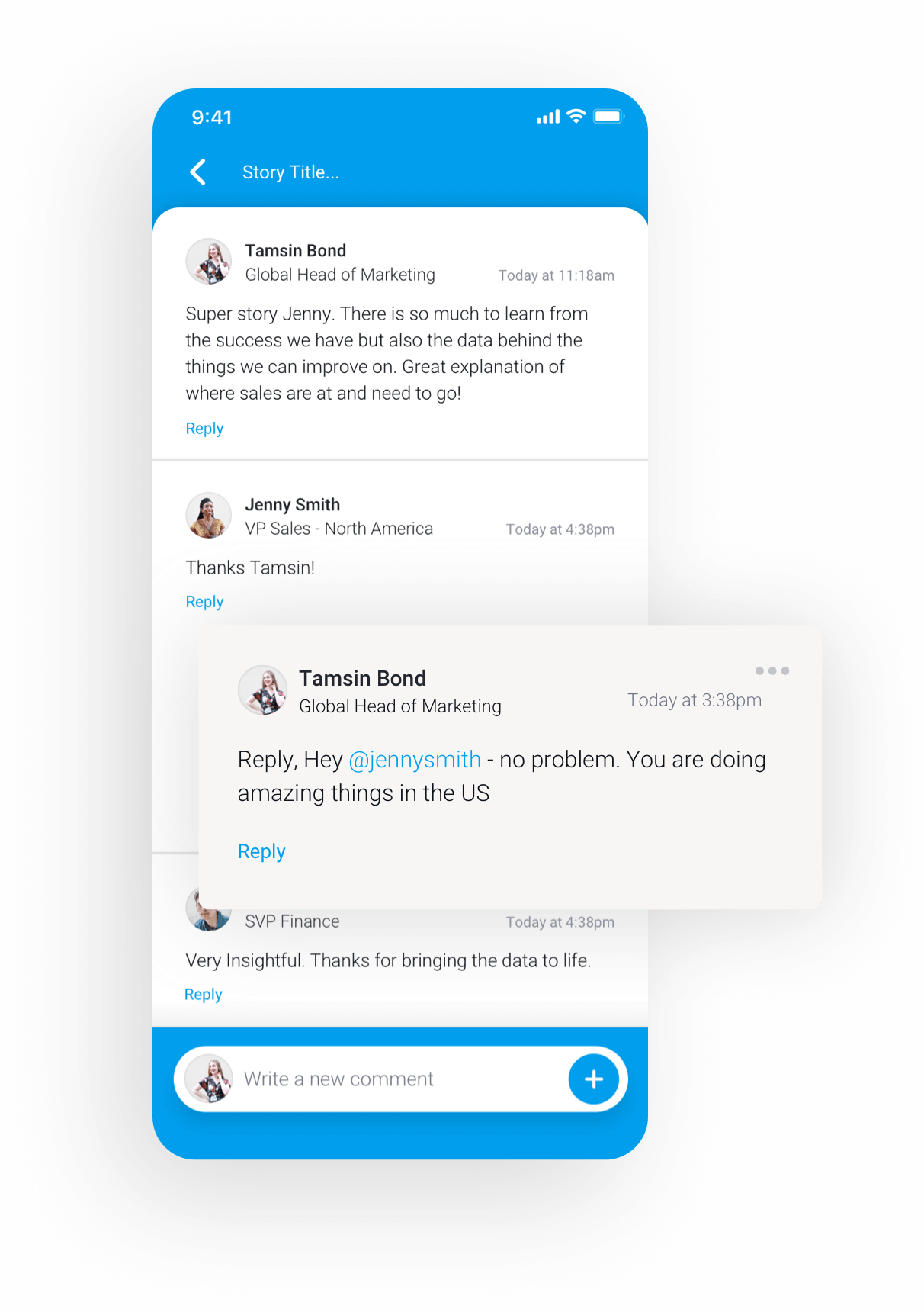 すべてのディスカッション、返信、フォローに Yellowfin モバイルアプリでコラボレーション