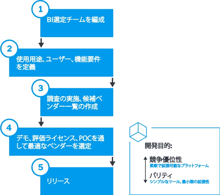 その際に「構築か購入か」という質問があります。自社で構築をするのか、それともプロジェクトの技術的・商業的ニーズを満たすBIベンダーにパートナー提携を要請するのか、ということです。