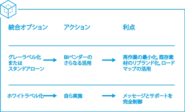 各オプションにはそれぞれ、長所と短所があります。顧客に最高の製品を提供したいのであれば、これが自社製品であることを明確に示し、競合との差別化を図るためにホワイトラベル化 / グレーラベル化が最も有効な選択肢でしょう。サードパーティ製ツールのブランドを維持する場合は、顧客の自社製品への「こだわり」や「愛着」が失われ、顧客は「なぜデータにアクセスするためにアナリティクスツールを使うことができないのだろう」と、疑問に思うかもしれません。