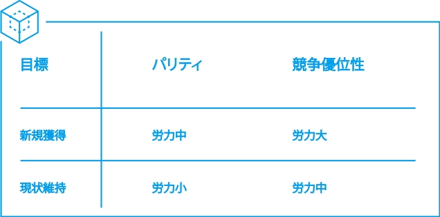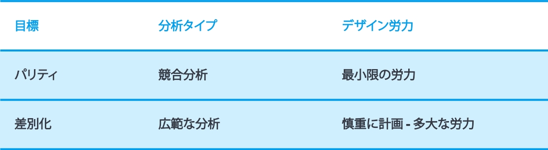 次の例を検証してみましょう。競合が素晴らしいアナリティクス機能を備えた製品をリリースしたことで、彼らの顧客は大いに満足しており、それに対して自社は市場に追い付こうとしているとします。このような場合、顧客が気に入るかどうか不明な機能を追加するために、必要以上のリソースを費やしたくはないでしょう。何が市場で受け入れられているのかを既に把握しているため、パリティ (同等の製品) の取得を求めています。このことが市場参入戦略を形成し、ソフトウェアスイートに組み込みアナリティクスを導入・実装することで達成しようとしている目的を定義します。