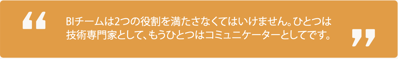 製品を市場に「投入」することで、顧客からのフィードバックをBIベンダーに報告することができます。ベンダーと強固な関係を築き、今後の製品展開方法についてオープンに話し合うことのできる、高レベルなコミュニケーションを確立しなくてはいけません。これには、不具合修正の迅速な対応や、顧客からのフィードバックを反映した製品の機能強化が含まれることもあるでしょう。