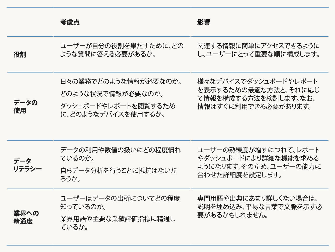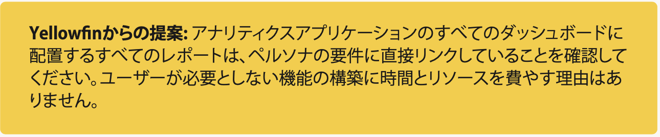 しかし、これは単純に一般的なアナリティクスソリューションを既存の製品に組み込むだけでは十分ではありません。プロジェクトを成功へ導くためには、誰が製品を使用し、彼らはどのような課題を解決しようとしており、そのためにどのような機能が必要で、それらのニーズを真に満たす組み込みアナリティクスソリューションをどのようにサポートできるのかを理解しなくてはいけません。