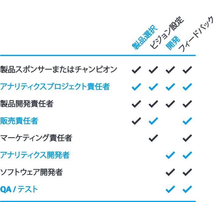ビジネスへのアナリティクスの導入を成功へ導くには、アナリティクスアプリケーションの開発ライフサイクル全体にわたる、様々な人材やスキルが必要になります。プロジェクトを推進するスポンサーから品質保証チームまで、成功のためにはすべての人々が必要不可欠です。