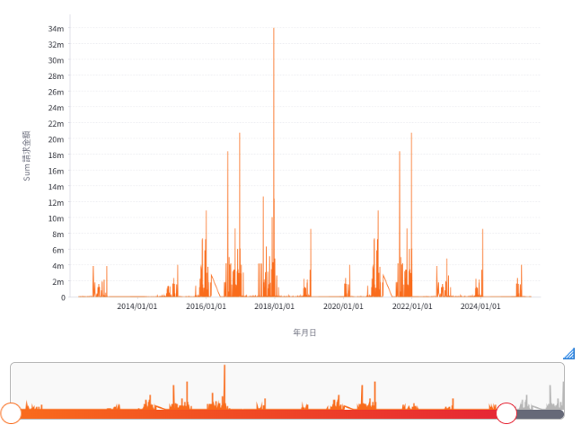 年間比較の開始月をカスタマイズ可能に - 年間比較は、日付軸を含むチャートで時系列オプションを有効にすると利用でき、データを年ごとの系列に分けて集計します。これまでは年間の開始月が常に1月に固定されていましたが、バージョン9.15ではこの開始月を任意に設定できるようになりました。