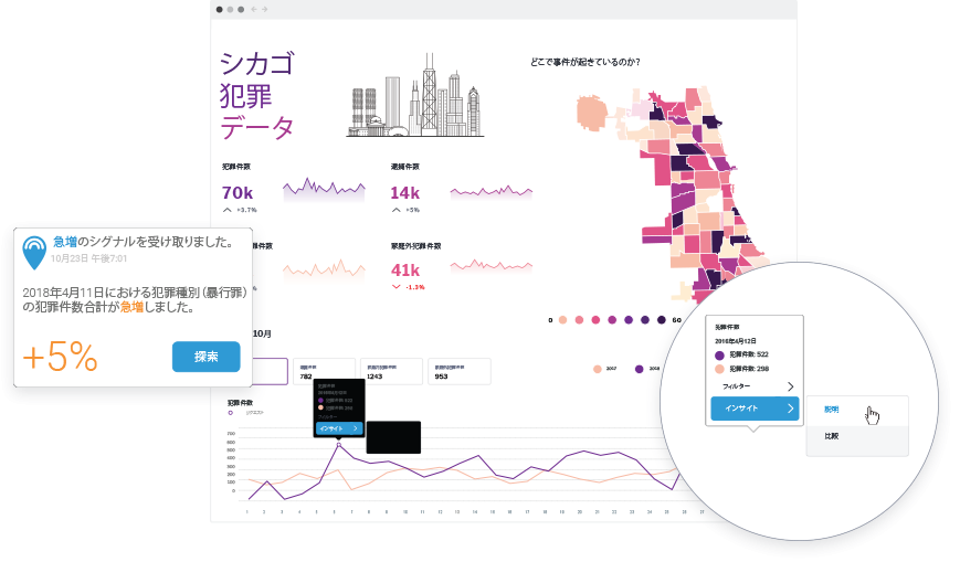 シグナルで生成される要素には、データ数値のパフォーマンスを示すタイムシリーズグラフ、同じタイムシリーズ内のその他既存のシグナル、データ変化に関する自然言語を用いた詳細な説明、その他データと特定のシグナルとの関連性などがあります。
